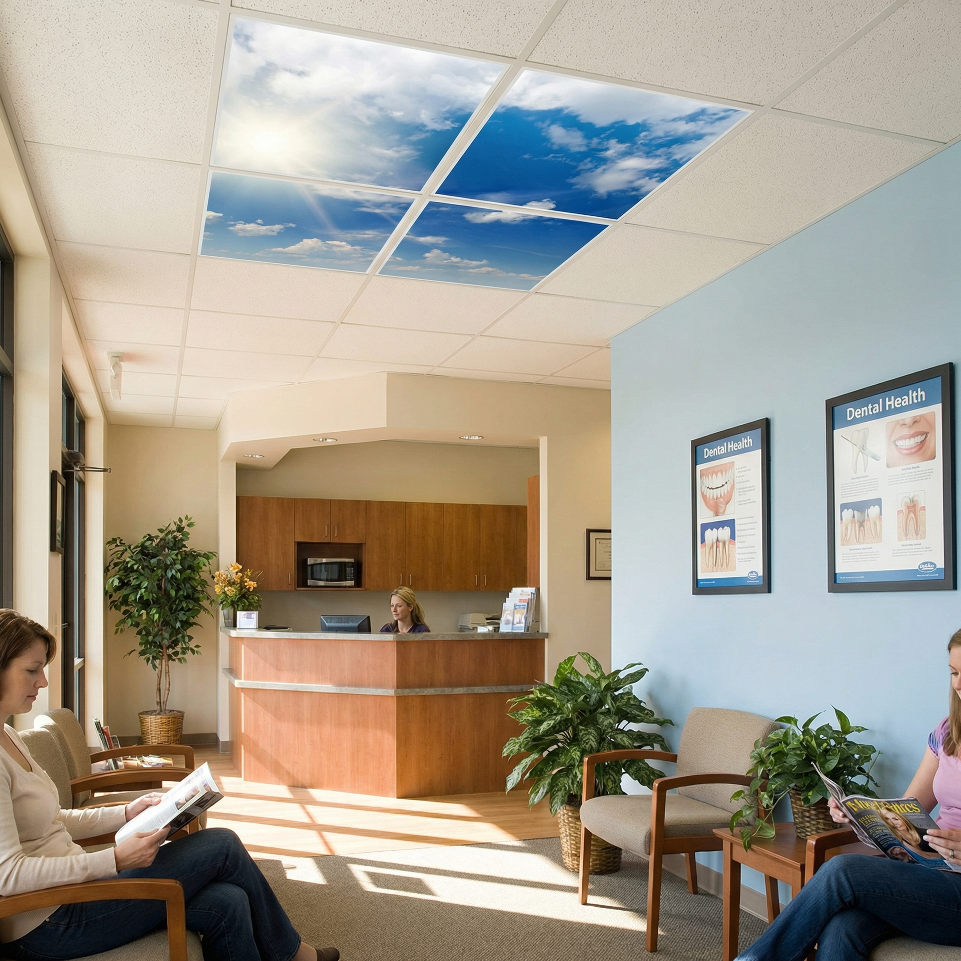 Apportez une belle luminosité à votre intérieur avec ces dalles imprimées ciel bleu et rayons de soleil. Son effet réaliste donne une impression d’ouverture et de bien-être, idéale pour un espace apaisant et chaleureux.